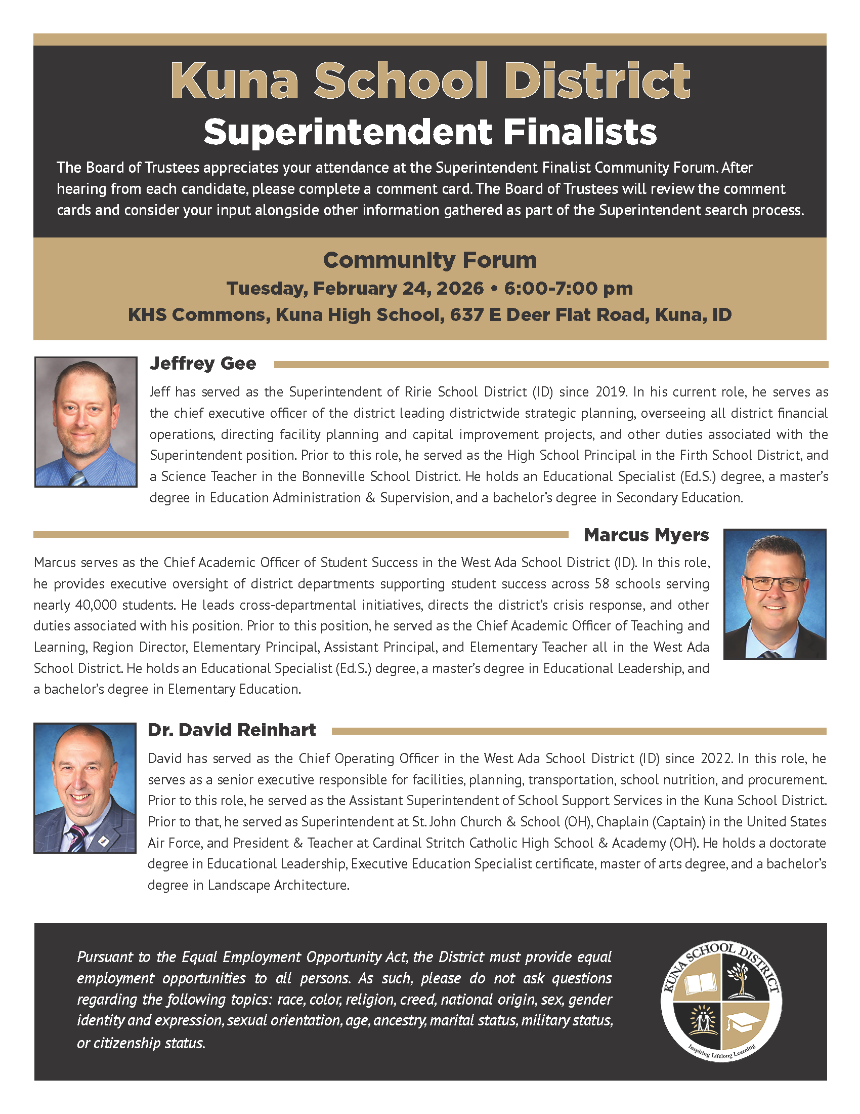 Join Us: Kuna School District Superintendent Finalists Community Forum – 6 p.m. Feb. 24 @ Kuna High School CommonsThe search for our next superintendent is nearing its conclusion, and the Kuna Scho...